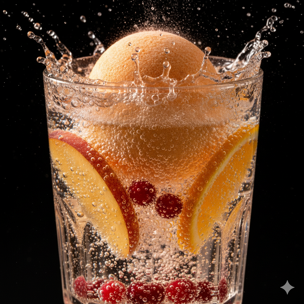 A burst of peach, orange, and cranberry packed into fizzy, flavourful cocktail/ mocktail bombs. Instantly transform water, soda, or alcohol into a vibrant drink—no mixing required. Vegan, alcohol-free, and easy to use. Perfect for parties or anytime refreshment—just drop, fizz, and enjoy summer in every sip!